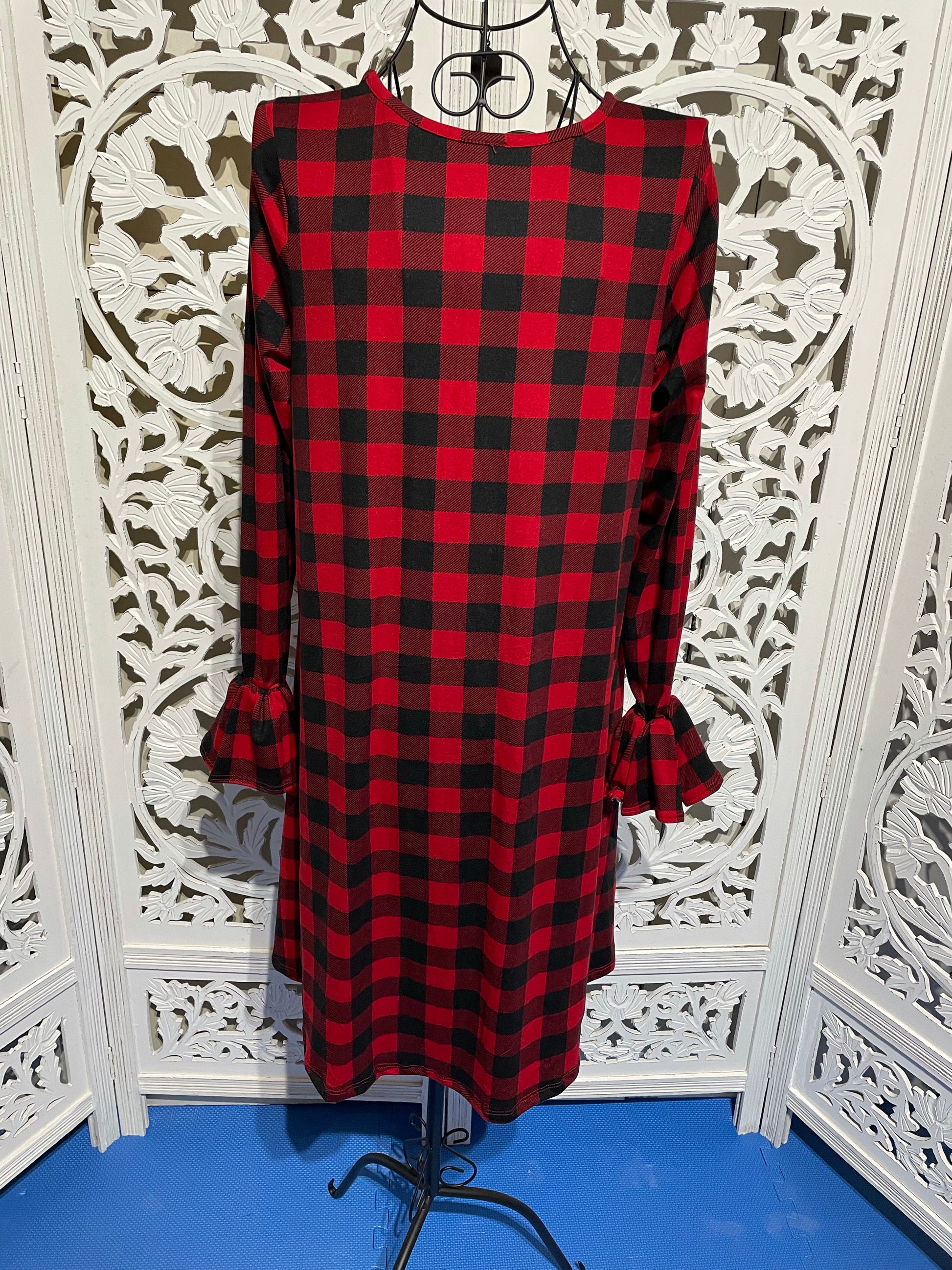 Red and Black Plaid Print Ruffle Long Sleeve Tunic Top. 96% Polyester 4% Spandex